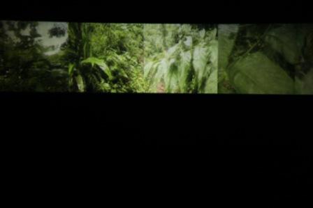 Durante el recorrido, en una de las paredes, encontramos una proyección compuesta por varios fragmentos donde vemos como se avanza en un espeso follaje. Ese avanzar es registrado por una mirada múltiple y simultánea, producto de la incursión de un cuerpo que podría ser el nuestro. Es como si tuviéramos varios ojos y registráramos fragmentariamente lo que vemos a nuestro paso.